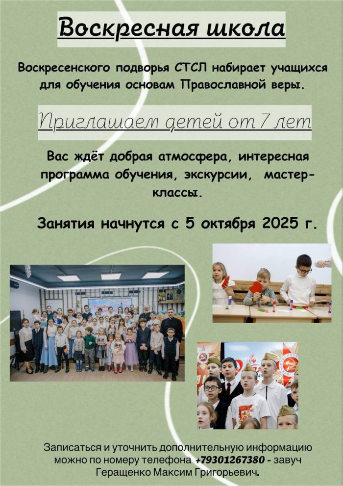 Занятия начнутся с 5 октября2025 г. и проходят каждое Воскресенье после поздней литургии с 10:30 и до 12:30.