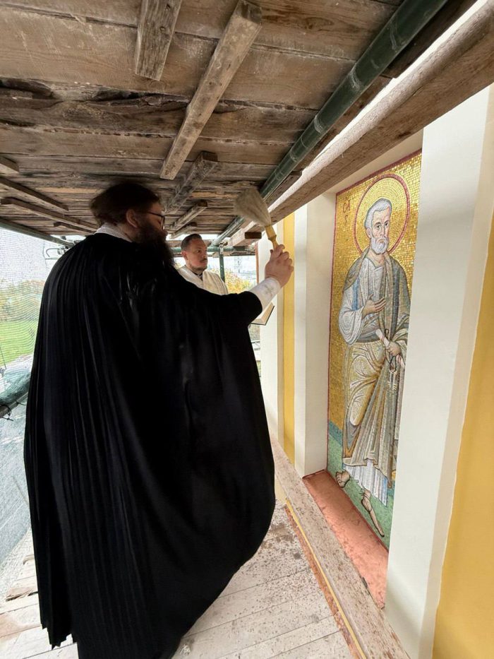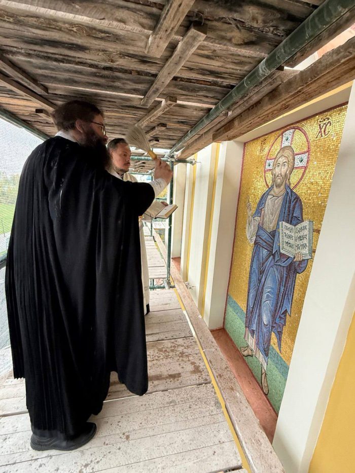 Сегодня, в предверии праздника преставление прп. Сергия, игумена Радонежского, в нашем храме настоятель иеромонах Виталий освятил мозаичные иконы Господа Вседержителя и апп. Петра и Павла, расположенных на восточном фасаде нашего храма.